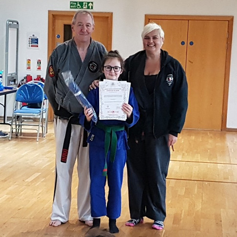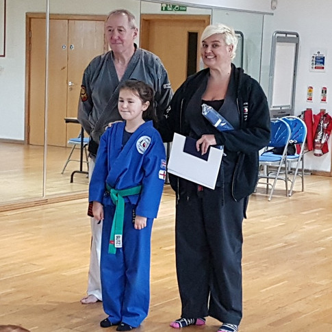 The exams were a success. Olivia, Sophie and Will passed their Blue (3rd Kyu) Belt gradings. Shihan Smith and Sensei Saunders presented them with their new blue belts and their certificates.