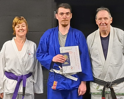 Wednesday 10th April was the day Barrie was presented with his 6th Kyu (White Belt) certificates. The presentation was made in the Bootle Dojo by Shihan Peter Smith and Sempai Emma Steven.